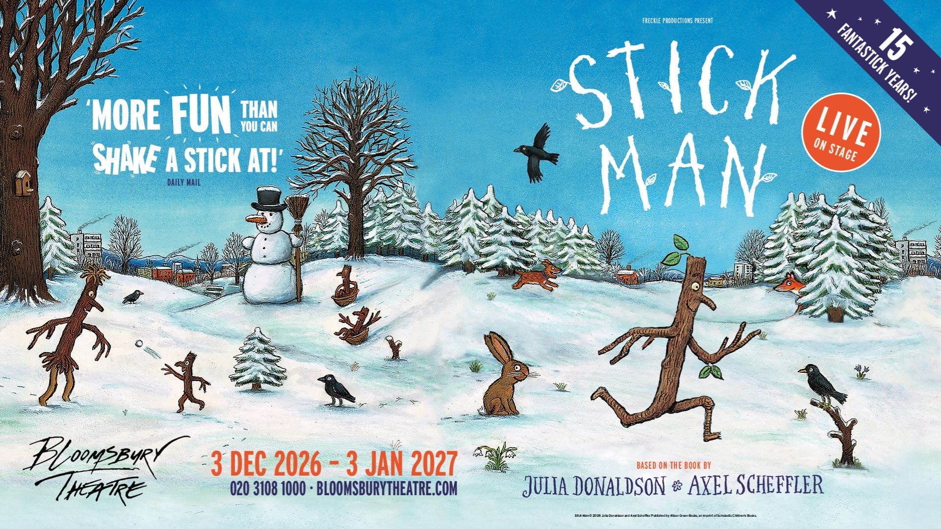 Stick Man, the much‑loved stage adaptation of Julia Donaldson and Axel Scheffler’s bestselling picture book, will return to London this winter for its 15th annual festive season while also opening in Sheffield for the first time.